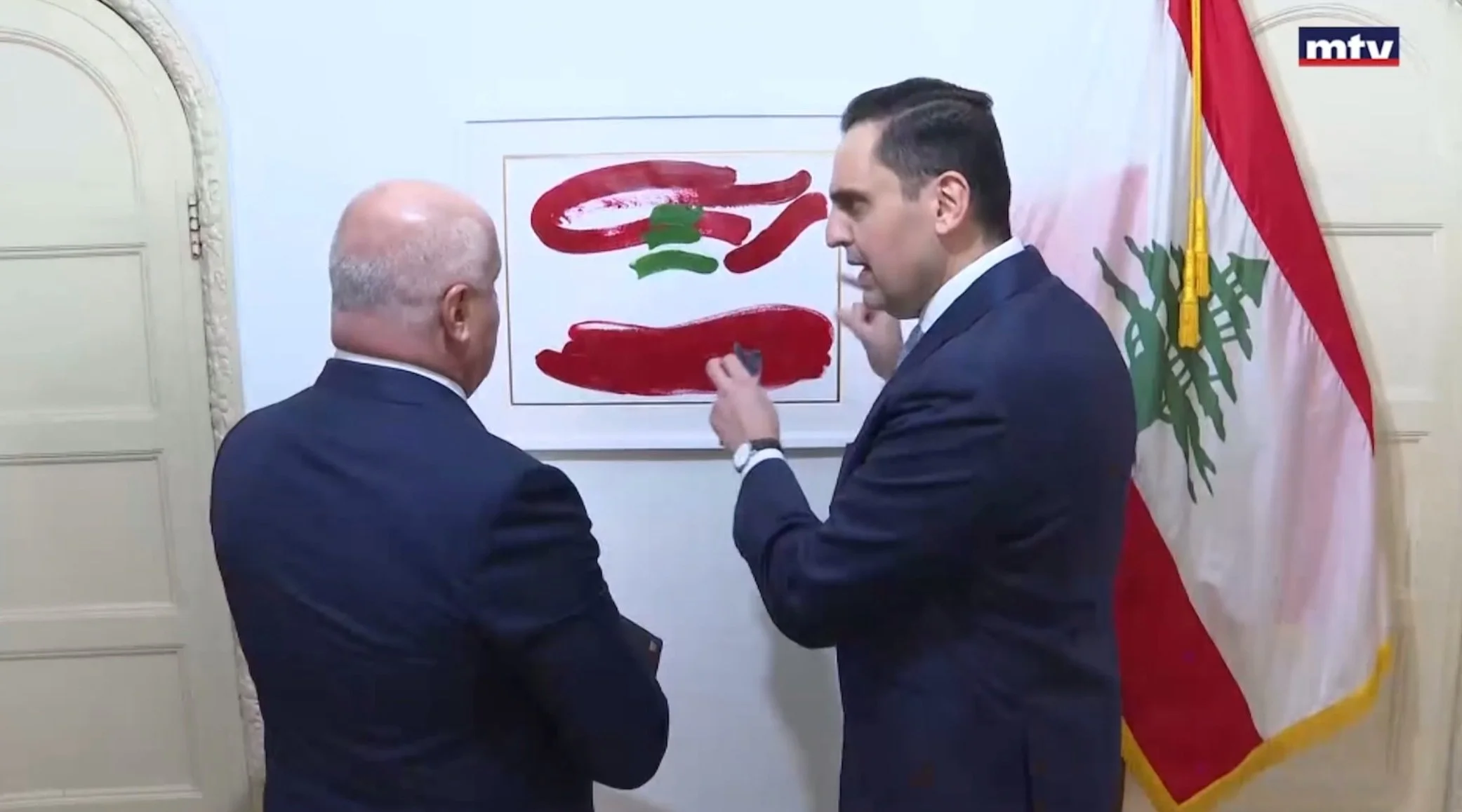 Majdi Ramadan, Consul General of Lebanon in New York, describing Karsouny’s flag painting, “Potential,” to Lebanese journalist Marcel Ghanem during his visit to Lebanon’s New York City consulate (as reported on MTV’s evening news in Lebanon on April 1, 2025).